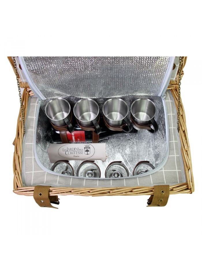 Le panier pique-nique "Concorde" est en osier naturel couleur miel. Ce panier pique-nique 4 personnes possède un magnifique tissu gris avec des carreaux blancs.