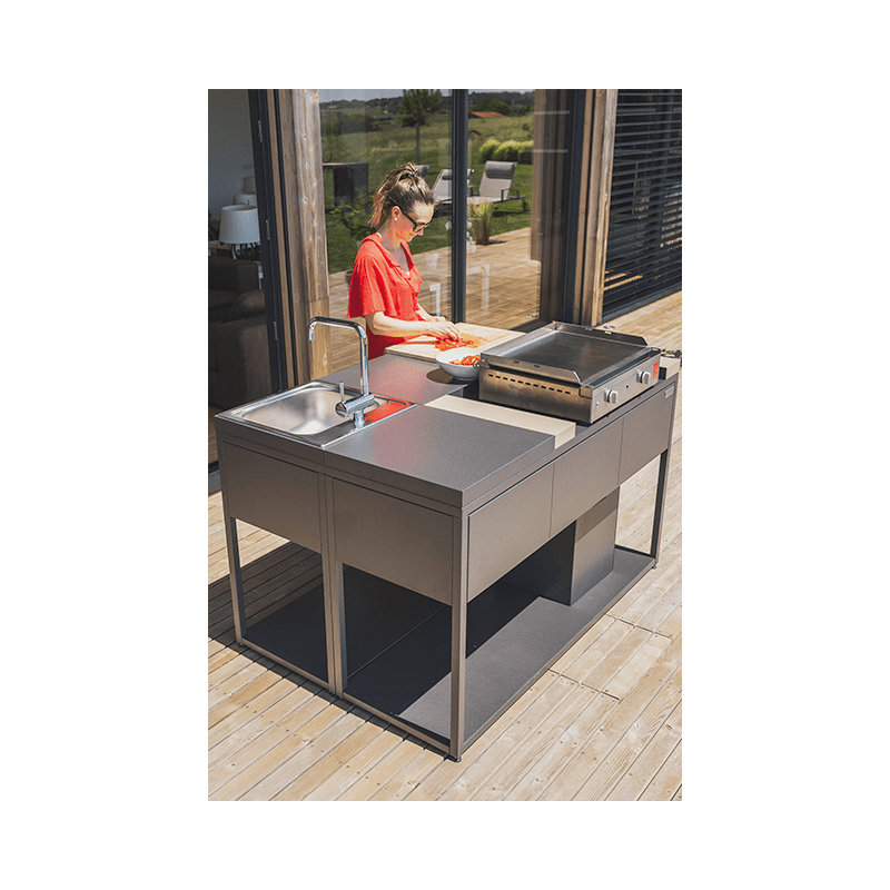 Le module support plancha mesure 100 cm par 50 et 5 cm d’épaisseur. Il occupe donc deux emplacements sur le meuble base cuisine outdoor Soleil Carré.