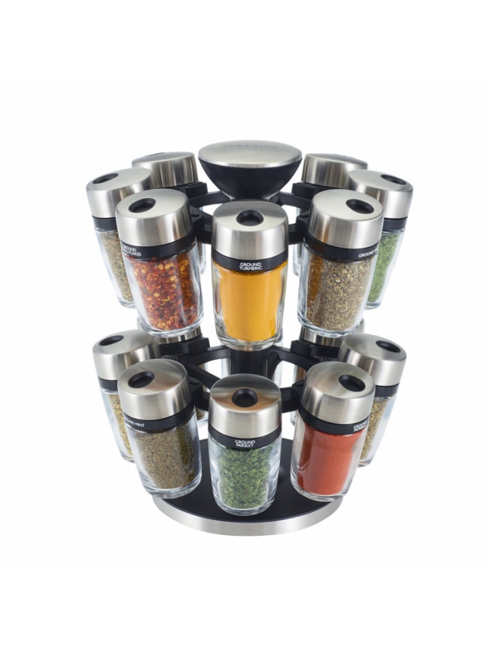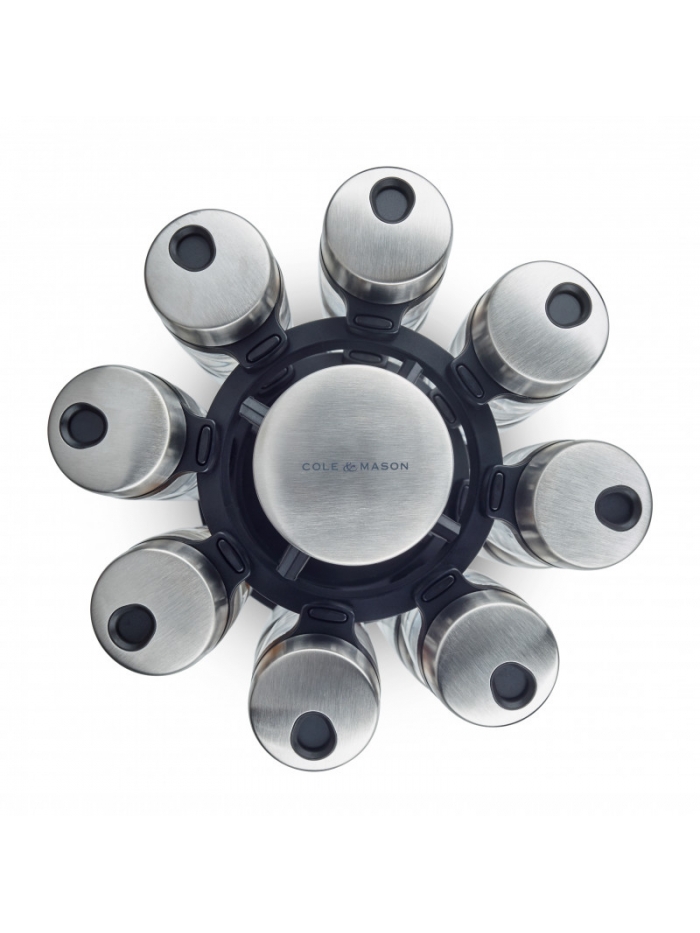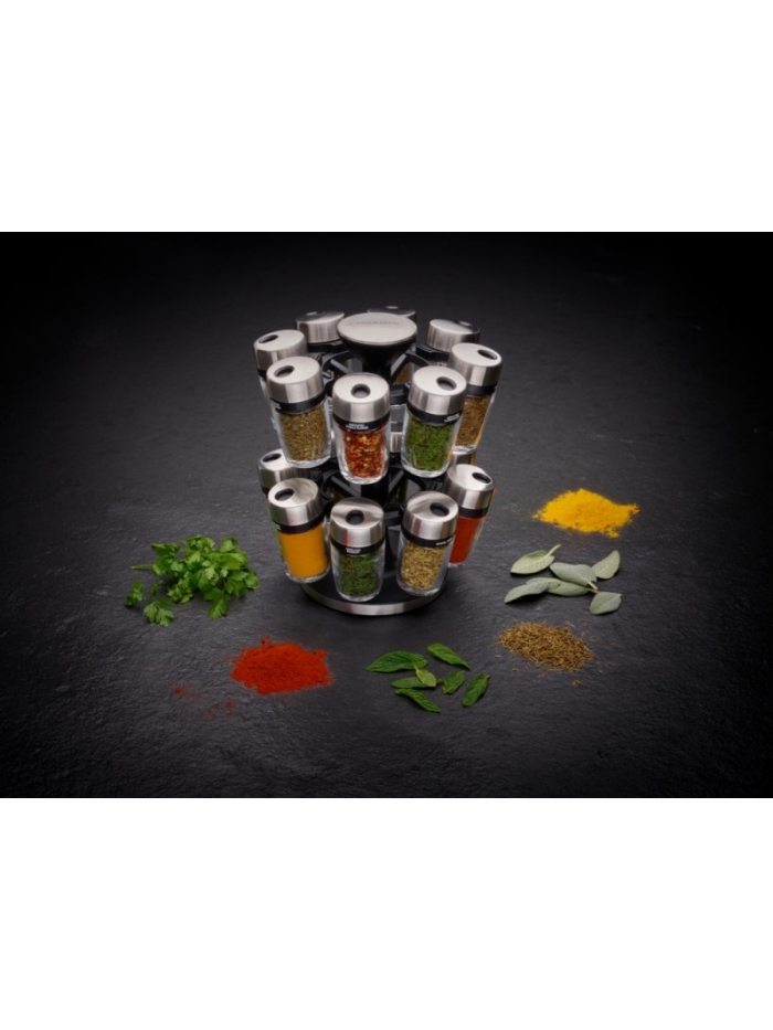 Les flacons en verre au design élégant sont dotés de couvercles chromés avec 3 positions: verser, saupoudrer ou fermer. Une petite étiquette en français sera apposée sur chaque couvercle pour pouvoir facilement sélectionner l'herbe ou l'épice dont vous avez besoin pour votre plat. Son nouveau design se veut très contemporain et pratique d'utilisation; la rotation est bien fluide et la poignée centrale suffisamment large pour un transport facile. Le système d'accroche des flacons est simple et intuitif, il permet un geste rapide.