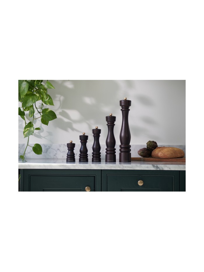 Le bouton en laiton sur le dessus du moulin rappelle la fierté de l'héritage anglais et lui confère une finition parfaite et haut de gamme. Equipé d'un mécanisme en acier carbone Precision+ pour fendre le grain de poivre, il est également garanti à vie. Mouture réglable de fine à grossière.