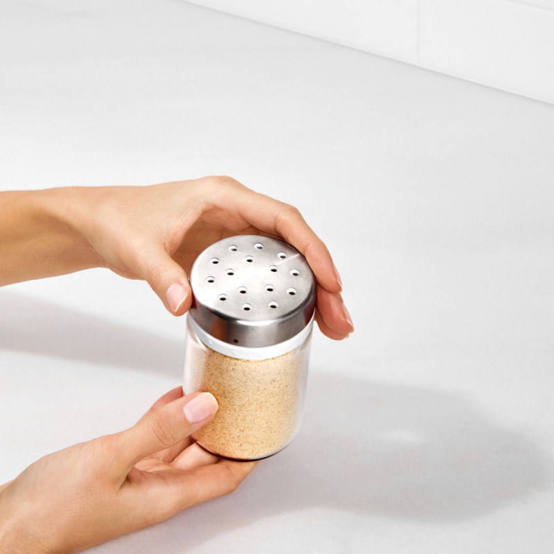 Ce couvercle offre aussi une position « fermeture » pour conserver les saveurs, préserver de l’air et de l’humidité et éviter que la saupoudreuse ne se renverse dans votre placard.