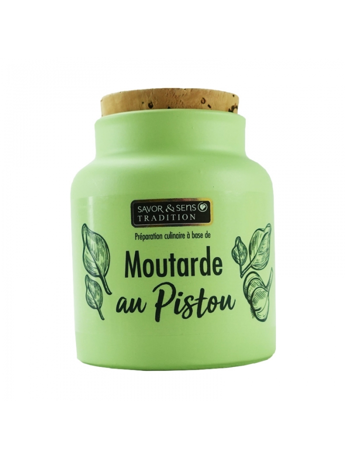 Liste des ingrédients : Moutarde 87 % (graines de moutarde, eau, vinaigre, sel, sucre, conservateur : sulfite acide de sodium), pistou 13% (basilic 43%, huile d’olive vierge extra 25%, huile de tournesol 25%, ail, sel)
