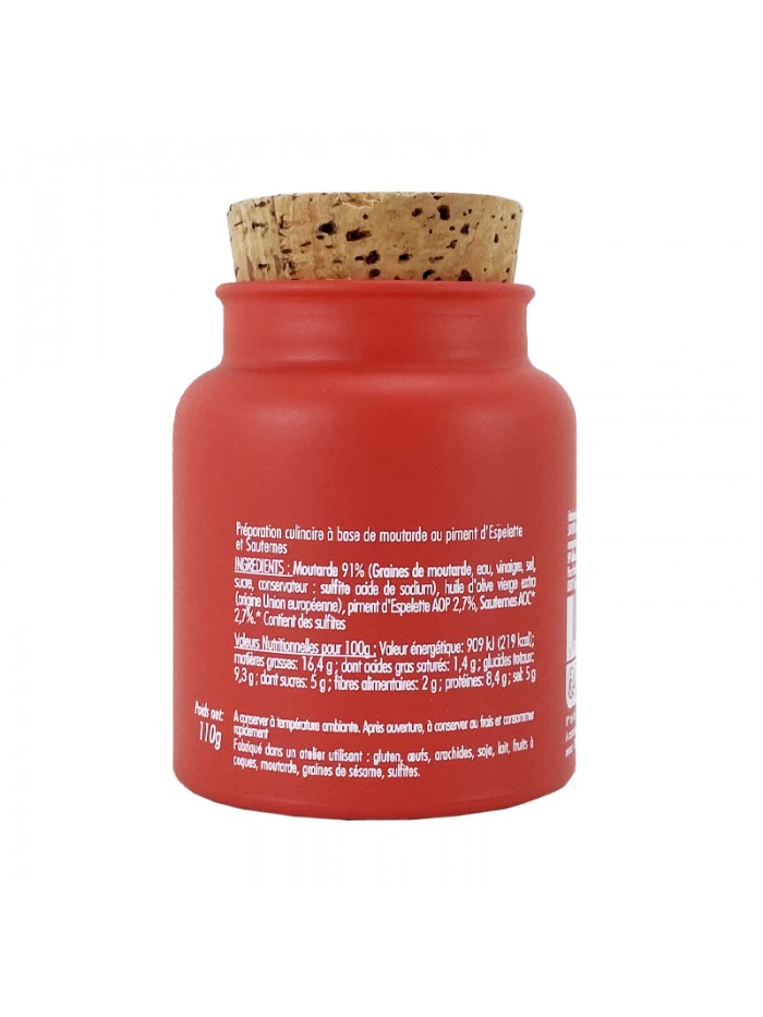 Liste des ingrédients : Moutarde 91%(graines de moutarde, eau, vinaigre, sel, sucre, conservateur : sulfite acide de sodium), huile d'olive vierge extra (origine Union Européenne), piment d'Espelette AOP 2,7%, Sauternes AOP* 2,7% *Contient des sulfites