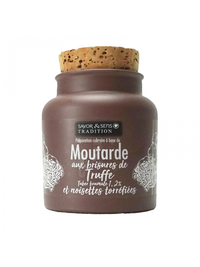 Moutarde 84,4% (graines de moutarde, eau, vinaigre, sel, sucre, conservateur : sulfite acide de sodium), Huile de noisette 8,5%, Noisettes 4,2%, Arome naturel, Brisures de truffe 1,2% (Tuber Brumale Vitt.)