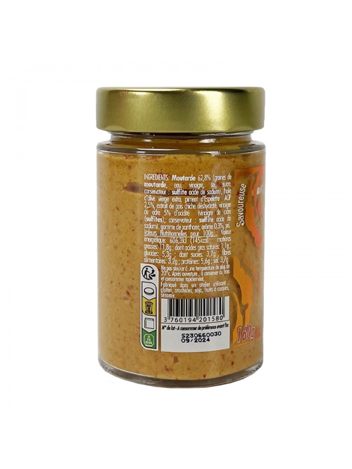 Liste des ingrédients : Moutarde 74% (graines de moutarde, eau, vinaigre, sel, sucre, conservateur : sulfite acide de sodium), sucre, jus de citron, eau, poivron rouge 1,5%, piment d'espelette 0,8%, paprika 0,6%, arôme 0,3%, curcuma, arôme naturel d'ail.