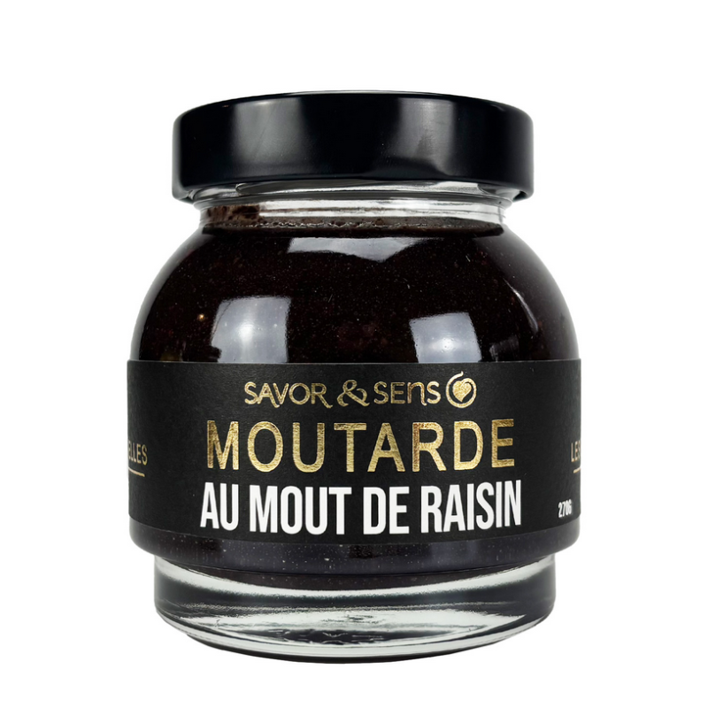 La moutarde au moût de raisin 270 g de Savor & Sens allie la force de la moutarde traditionnelle à la douceur naturelle du raisin, parfaite pour sublimer viandes, fromages et vinaigrettes.