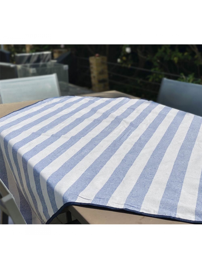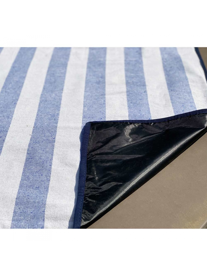 Cette nappe bleu ciel et blanc à grandes rayures et revers imperméable sera parfaite pour partager un moment unique autour d'un grand pique-nique en famille.