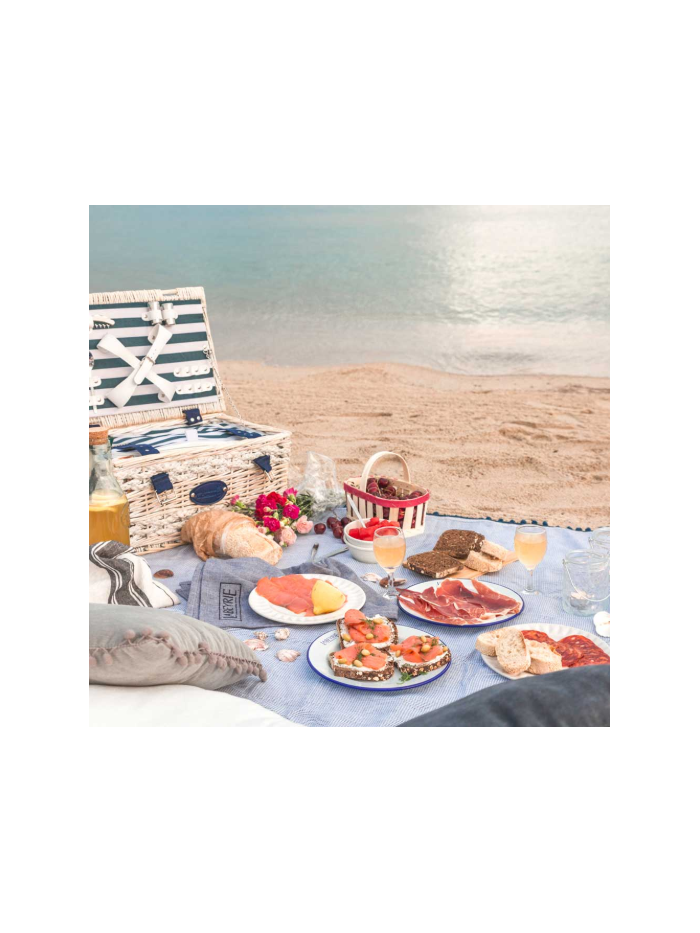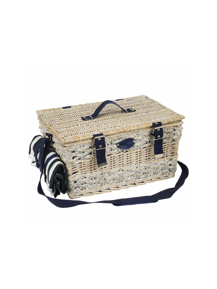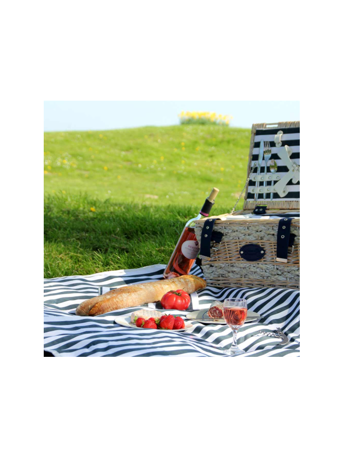 Ce panier pique-nique 4 personnes a été conçu pour les familles et les amis qui aiment se retrouver pour partager un moment festif à la campagne, dans les dunes ou au bord de l’eau. Un superbe cadeau original. Comme les autres paniers, ce panier pique-nique 4 personnes est tressé à la main en brin de saule et cordage. Un panier complet et élégant en osier blanc cassé avec son intérieur en tissu bleu à rayure blanche pour un pique-nique chic et raffiné. Toute la base forme un compartiment isotherme pour y garder les produits et les boissons au frais. Il est livré avec une magnifique couverture de pique-nique de même tissu au revers imperméable. Vous pouvez le transporter facilement grâce à sa poignée centrale ou à sa sangle réglable en tissu bleu marine pour le porter facilement en bandoulière. Pour vous faciliter la vie, Les Jardins de la Comtesse ont glissé un petit sac imperméable qui vous permettra de ranger la vaisselle sale après votre pique-nique.