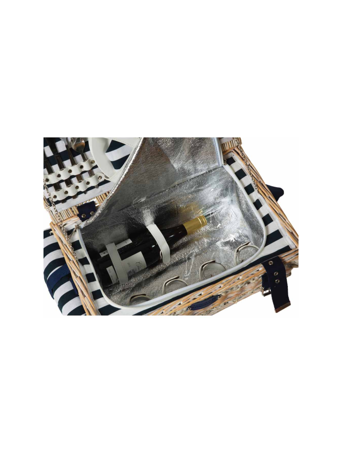 Un panier pique-nique 4 personnes unique et original avec ses sangles bleues. Original à l’extérieur avec des rangs de cordages se mêlent à l’osier naturel patiné de blanc. Les sangles bleues et la nappe bleue et blanche lui donne une touche exotique qui appelle le grand large. Élégant à l’intérieur avec son tissu bleu à rayure blanche et ses sangles de couleur blanche. Il est tendance, chic et raffiné avec son mélange de couverts en acier inoxydable et assiettes en céramique monogrammées.