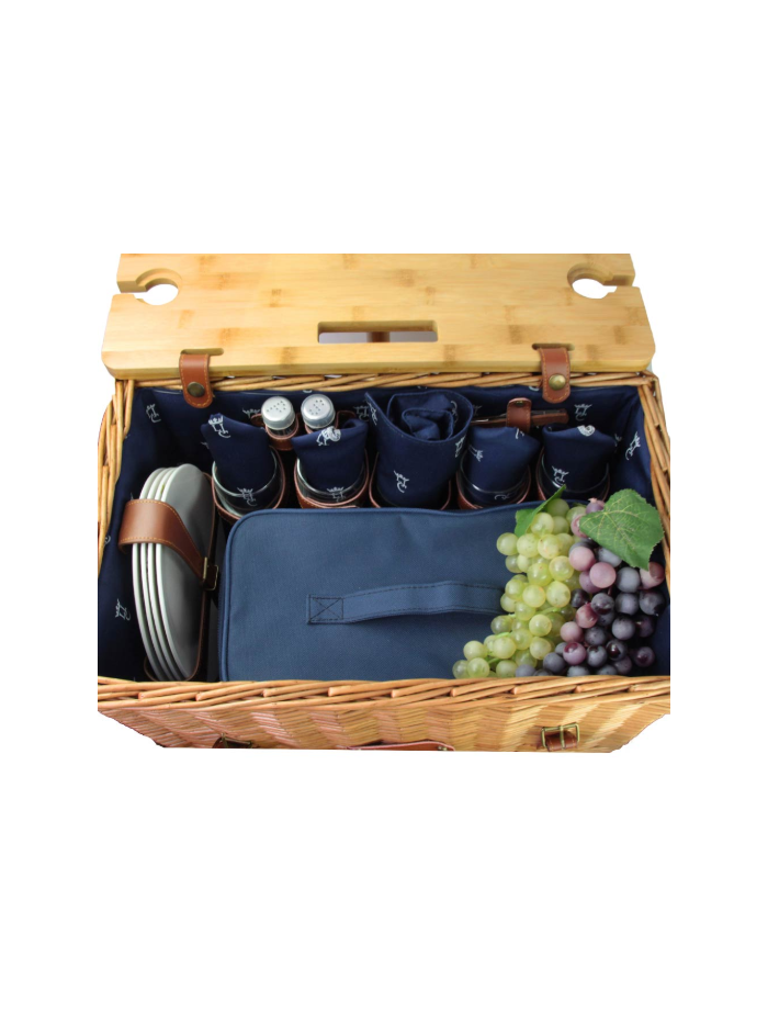 C'est aussi un panier de prestige grâce à ses sangles en cuir véritable grainées et surpiquées, ses couverts en acier inoxydable dans leur porte-couvert, son porte-bouteille isotherme, ses napperons monogrammés ainsi que sa grande poche isotherme assez grande pour y mettre une bouteille. Le panier pique-nique est vendu avec toute sa vaisselle et ses accessoires pour faciliter vos pique-niques. Pour vous faciliter la vie, Les Jardins de la Comtesse ont glissé un petit sac imperméable qui vous permettra de ranger la vaisselle sale après votre pique-nique.