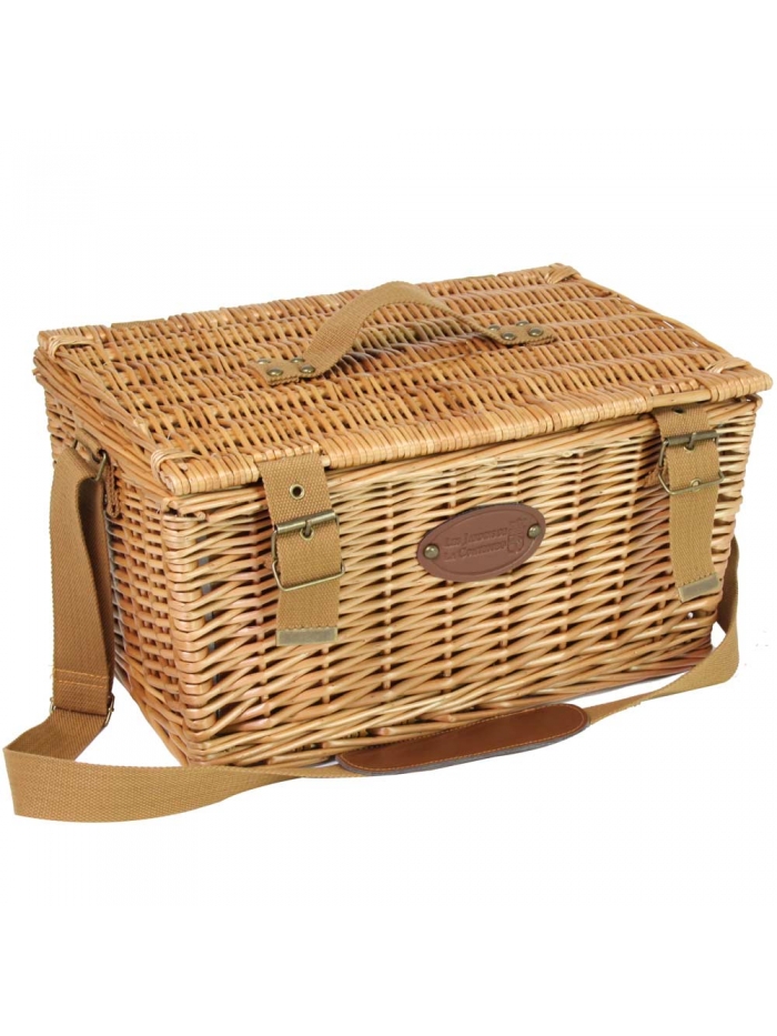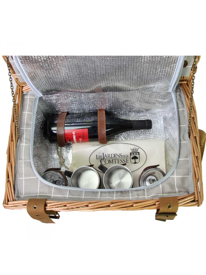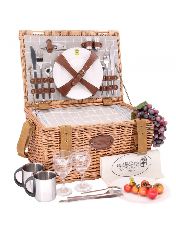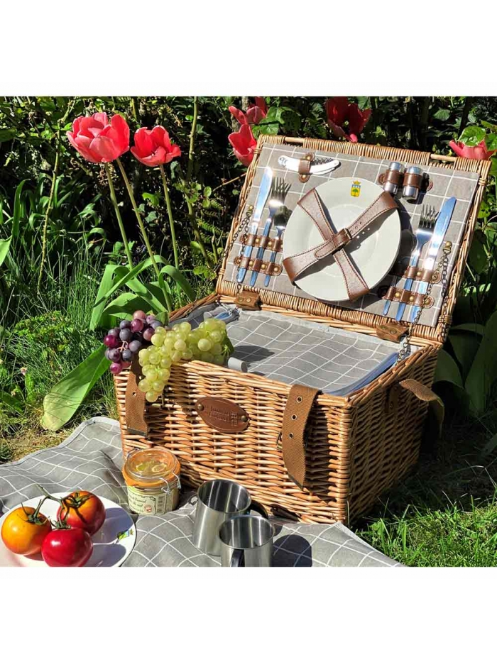 Un panier pique-nique complet et élégant en osier couleur miel. Son intérieur est raffiné grâce à son tissu gris et blanc.