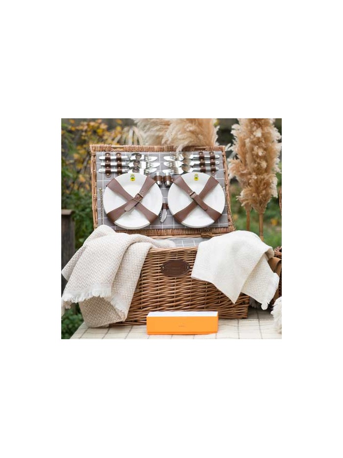 Ce panier pique-nique de grande taille, complet et élégant est tressé à partir d'un osier de couleur miel. Il est composé d’un très joli intérieur en tissu gris et blanc. Sa taille ainsi que son contenu permettent aux familles ou groupes d’amis d’organiser des pique-niques à plusieurs.