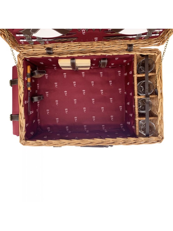 - 4 grands verres à pied (18 cl) aménagés dans des compartiments individuels en osier maintenus par une lanière en croûte de cuir.