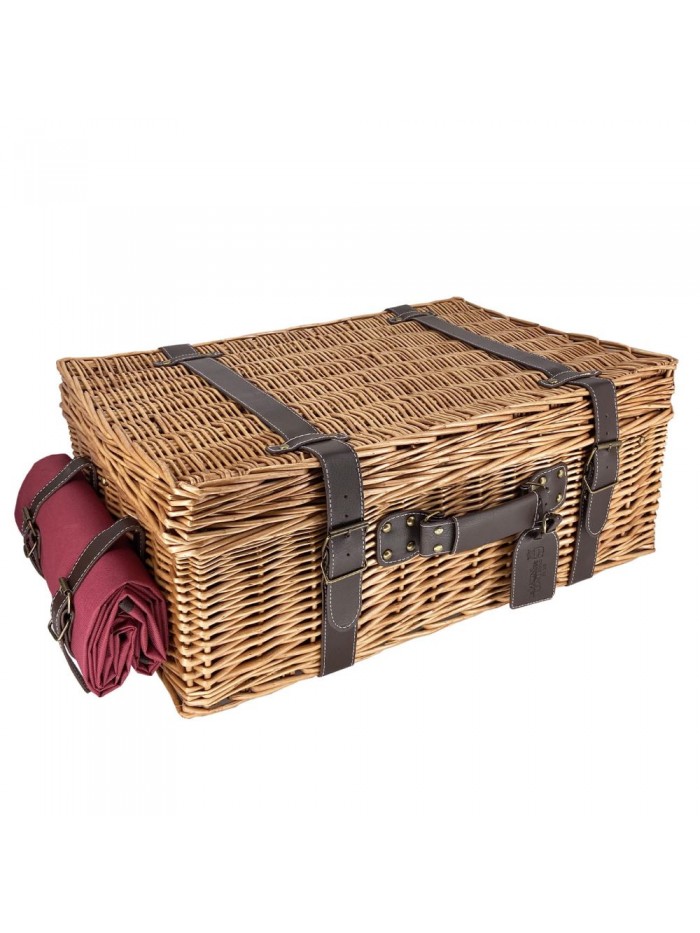 Ce panier pique-nique 4 personnes a été fabriqué artisanalement en saule. Il est composé de 2 grandes sangles en cuir surpiqué, rivetées et terminées par 2 boucles en métal pour la fermeture.