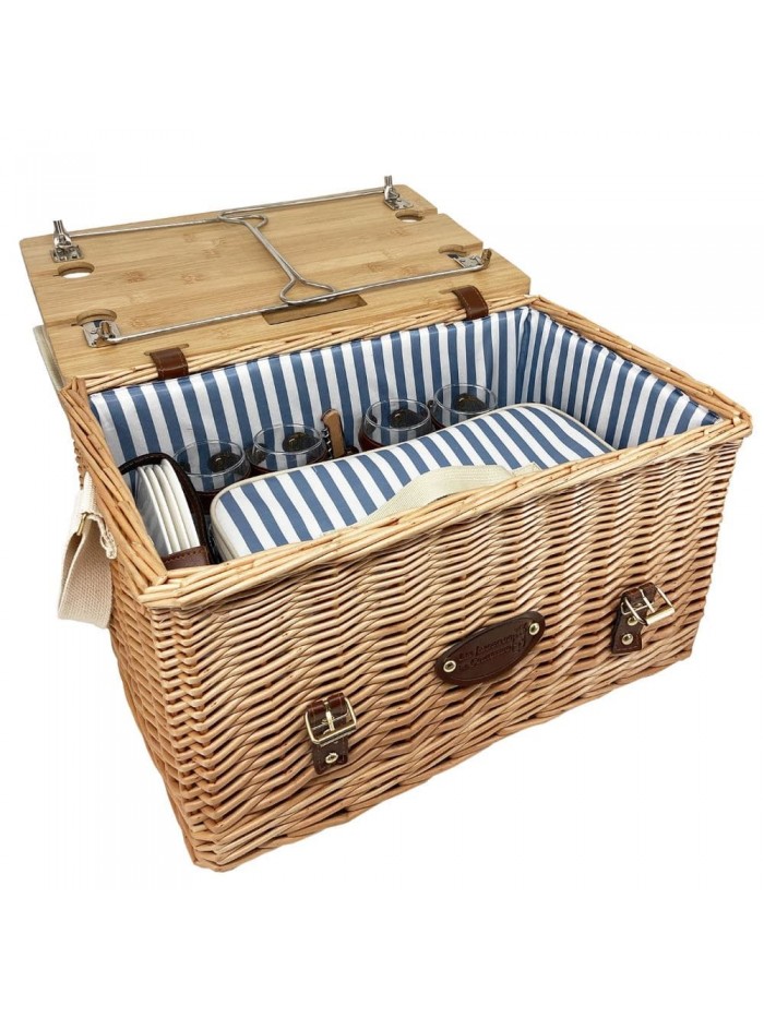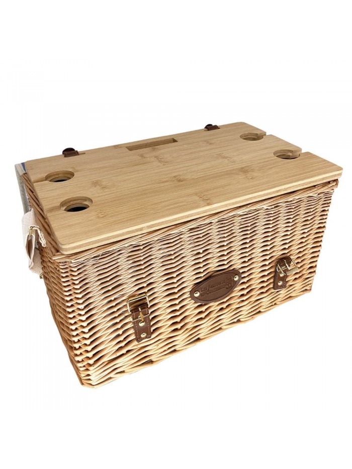 Le panier pique-nique Saint-Malo fait partie de la collection de paniers les plus innovants. Une fois le panier pique-nique ouvert, il suffit de déplier les pieds positionnés sous le couvercle pour obtenir une petite table stable. Les encoches prévues sur la table vous permettent d'y glisser les verres à pieds et ainsi éviter qu'ils se renversent.