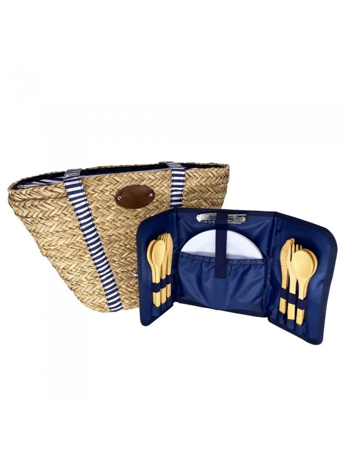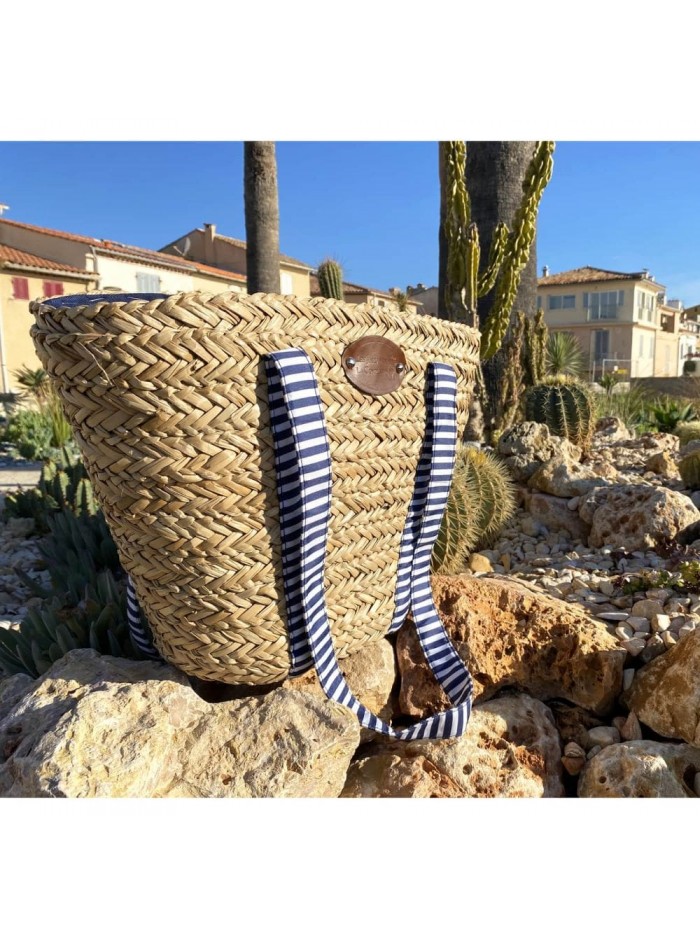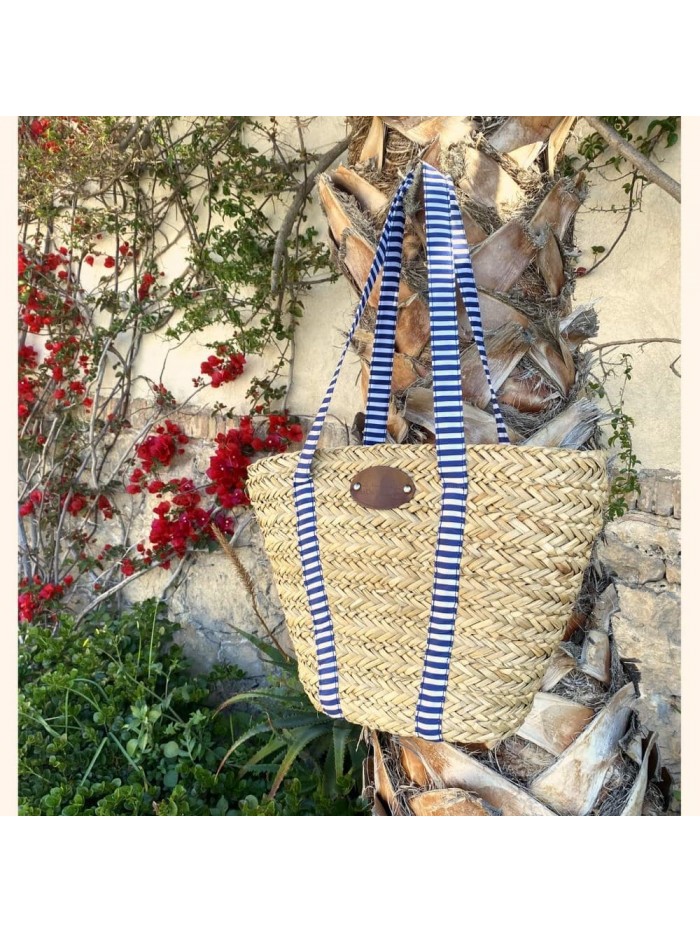 Réhaussé d’un joli tissu bleu et blanc à rayures, ce panier sera l’accessoire indispensable de vos vacances à la mer.