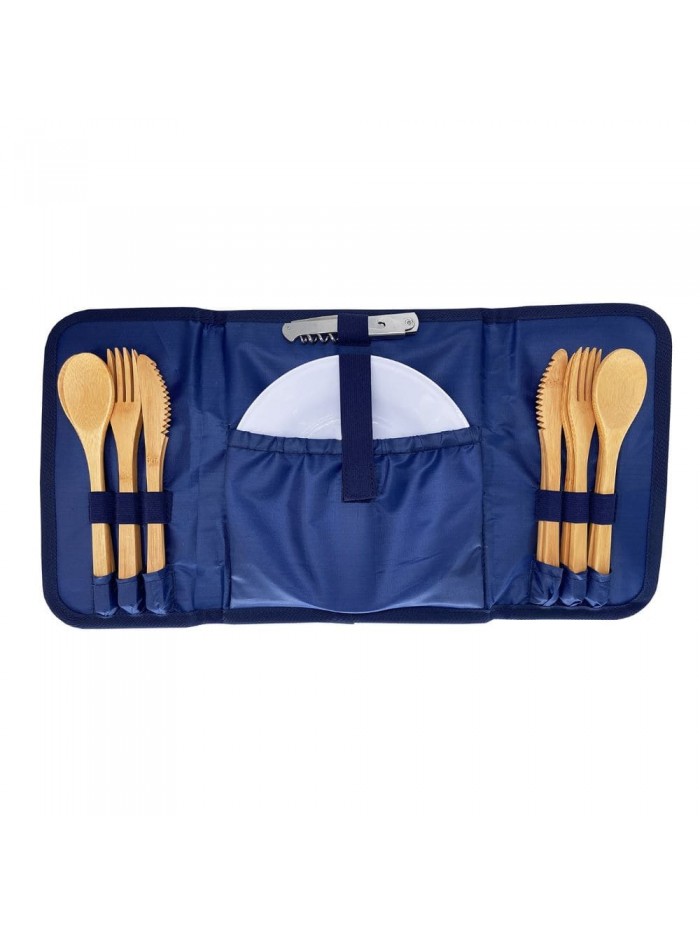 Il comprend aussi un set avec des couverts en bambou et des assiettes pour 4 personnes ainsi que des verres en polypropylène légers et incassables.