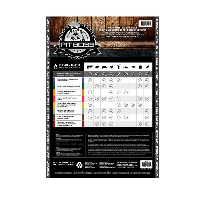 Pit Boss Compétition Blend est un mélange complexe mais sélectif qui est polyvalent et peut être utilisé avec toute sorte de produits. Pas de saveurs artificielles, de parfums pulvérisés, de colles ou de produits chimiques : Les granules de bois dur Pit Boss sont 100 % naturels.