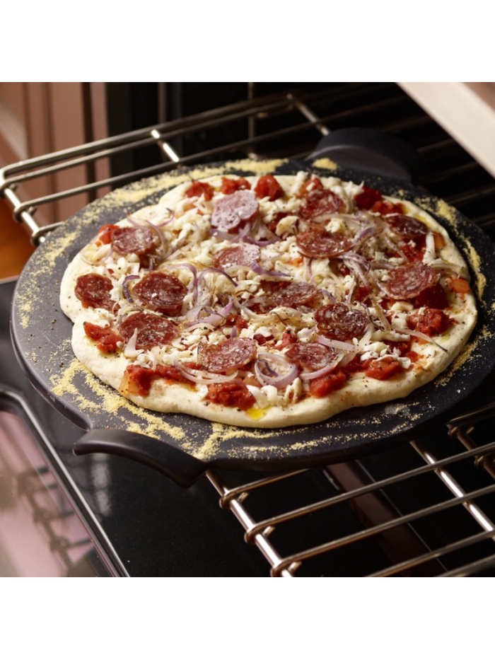 Ses deux larges poignées, permettent de facilement manier la Pizza Stone du four à la table. Elle gardera la pizza chaude pendant toute la durée du repas et vous pourrez la couper à même la céramique.