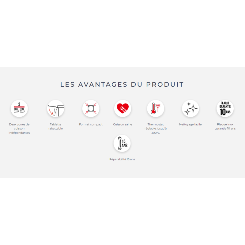 La plaque en inox permet de cuisiner une grande variété d’aliments de l’entrée au dessert sans ajout de matière grasse, en préservant les goûts et sans mélange de saveurs.