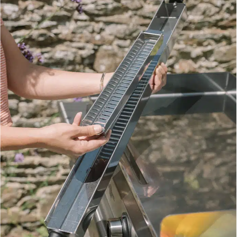 L’évacuation des résidus et des jus se fait via une fente à l’avant de la surface de cuisson.