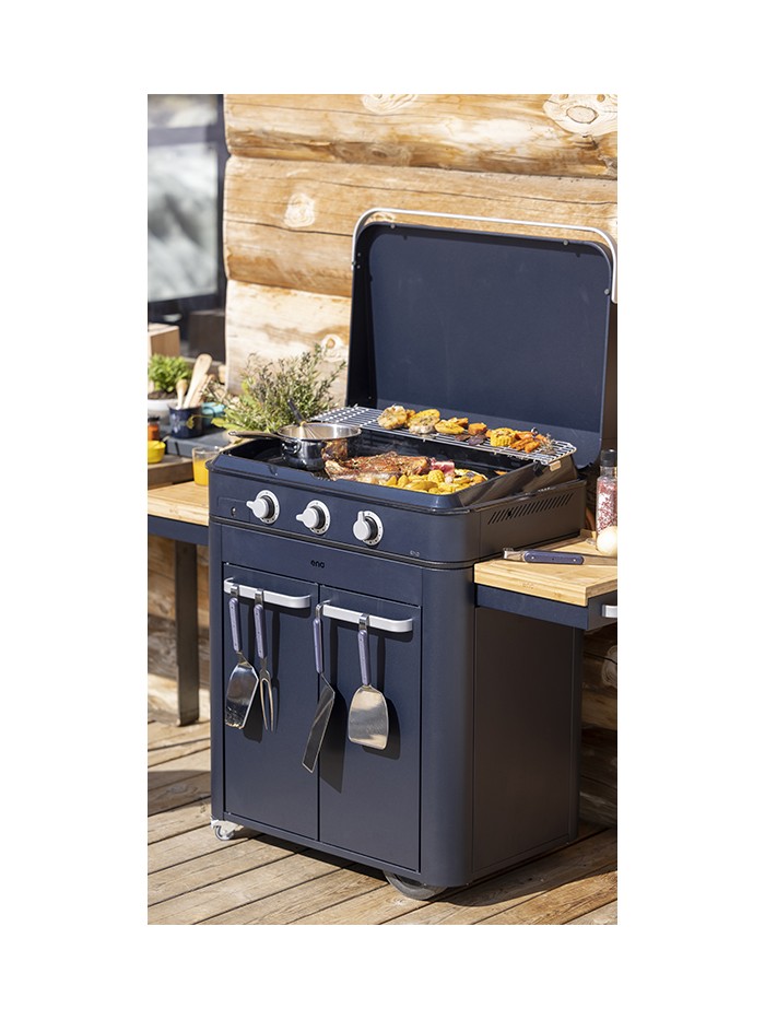 La Plancha Enosign 80 Gaz Bleu Navy est une plancha avec plaque en fonte émaillée et châssis en acier galvanisé. Équipée de 2 brûleurs , elle permet de cuisiner pour environ 8 à 12 personnes.