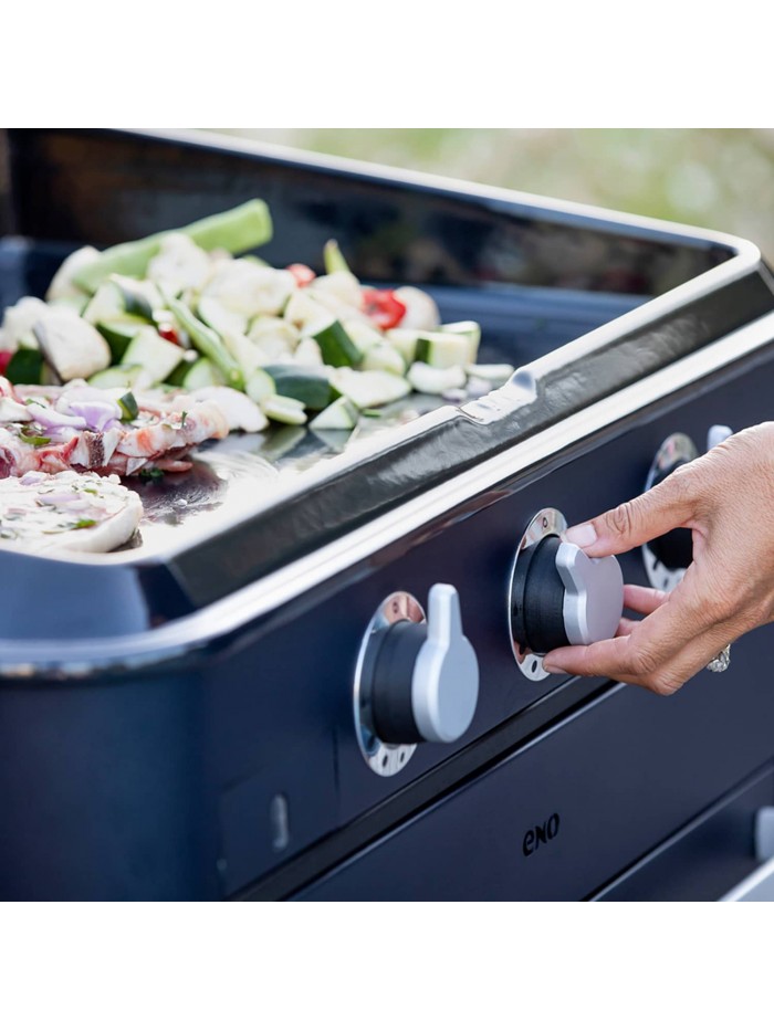 La plaque en fonte permet de cuisiner une grande variété d’aliments de l’entrée au dessert sans ajout de matière grasse, en préservant les goûts et sans mélange de saveurs. La Plancha Enosign 80 Gaz Bleu Navy est un appareil de cuisson d’extérieur qui fonctionne au butane/propane.