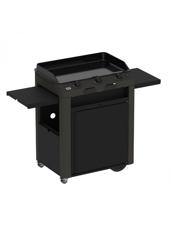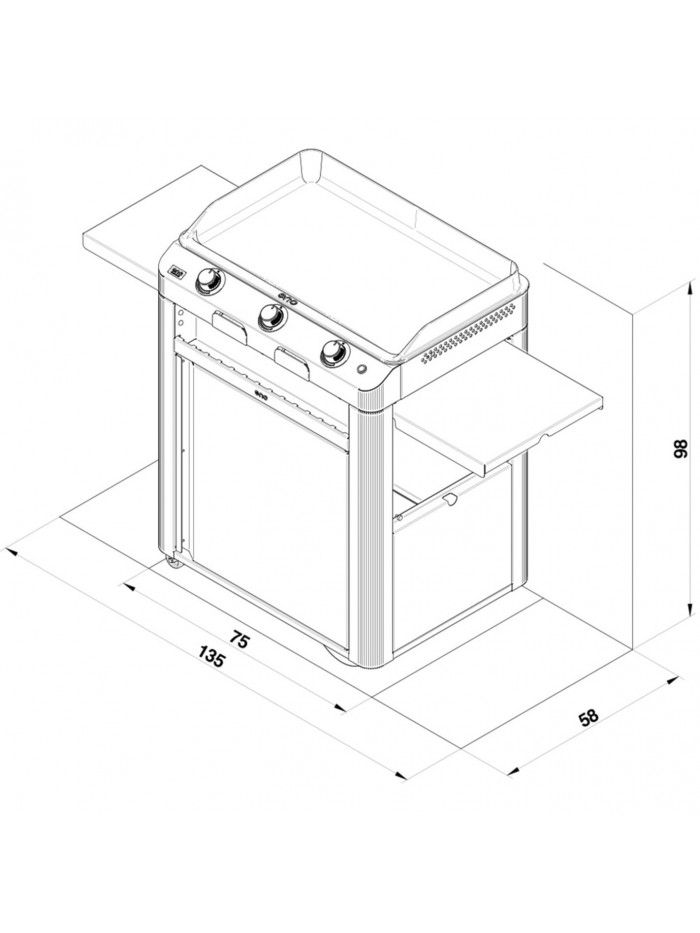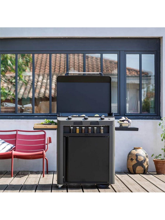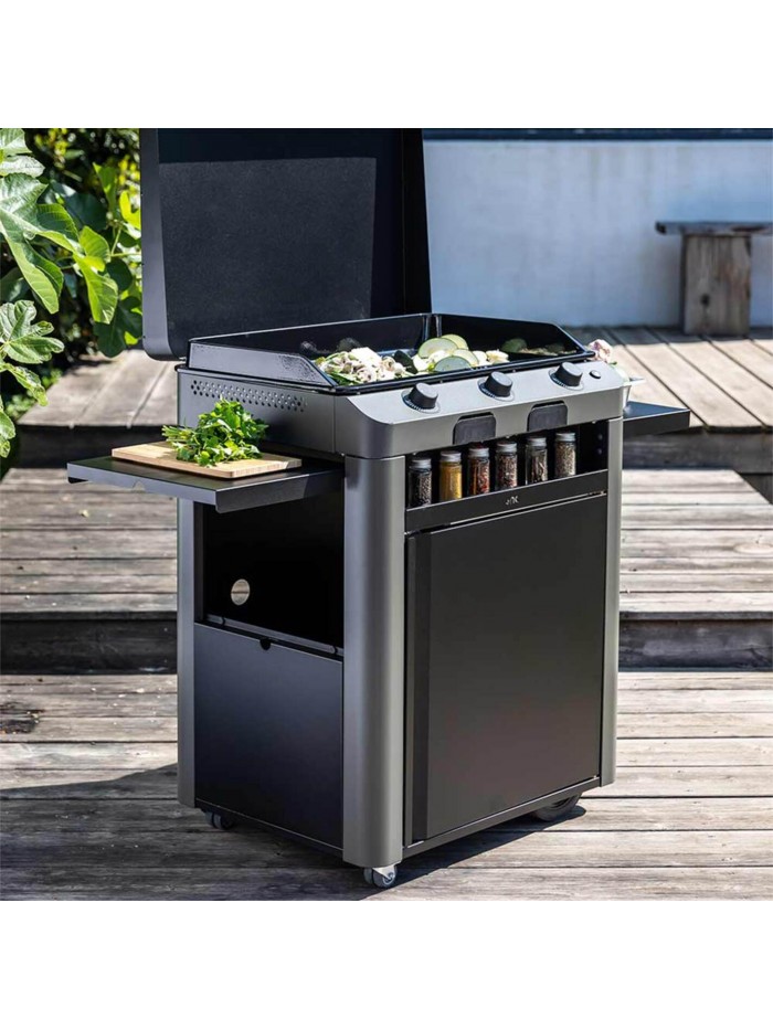 Les tablettes latérales vous permettent d'y poser des ingrédients et des préparations. Le plateau inférieur peut accueillir une bouteille de gaz.