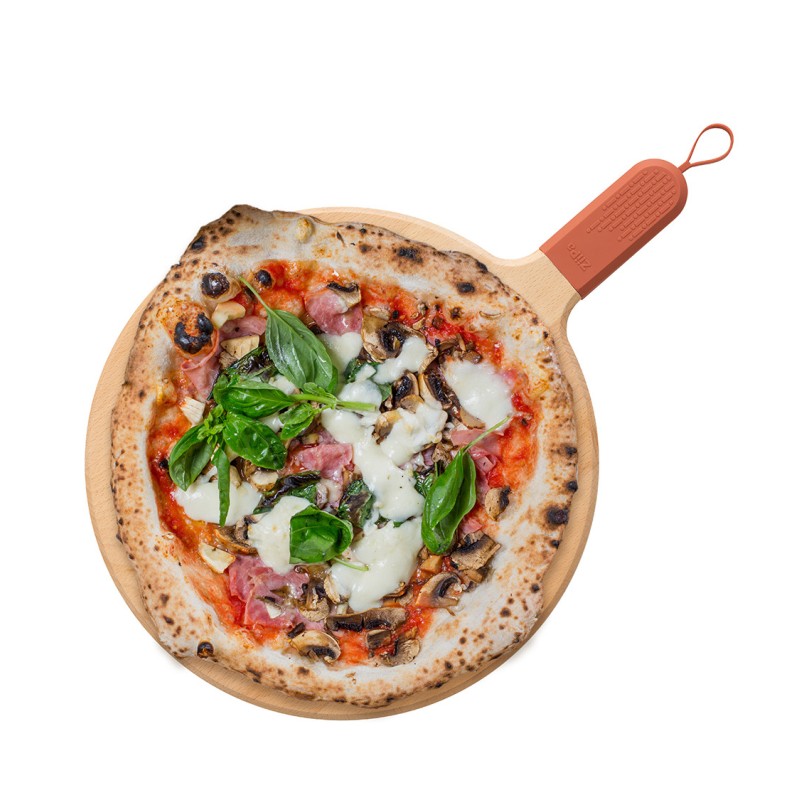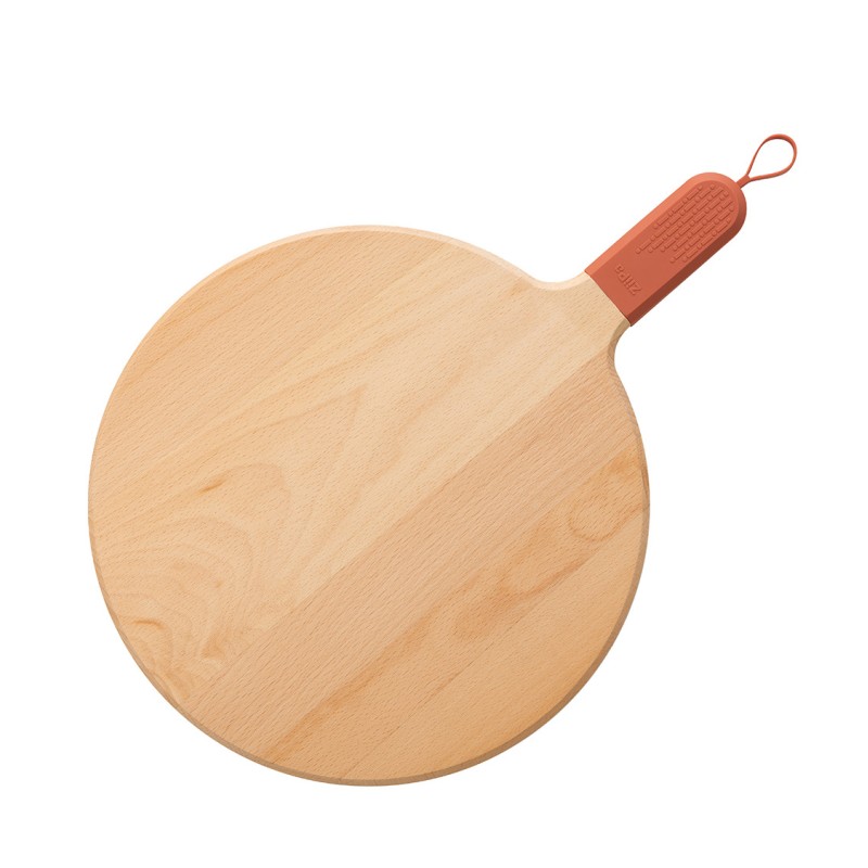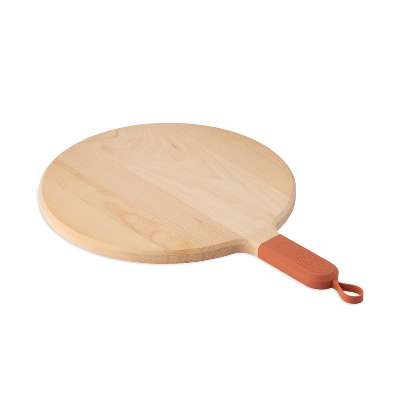 Le bois de hêtre est ce qui ce fait de mieux pour les planches de service et découpe. Cette grande planche en bois d'un diamètre de 31 cm sera parfaite pour accueillir vos pizzas à la sortie du four. Chaque planche est unique et comme nous pensons à tout, nous avons ajouté une jolie poignée colorée en silicone avec un lien pour accrocher votre planche.