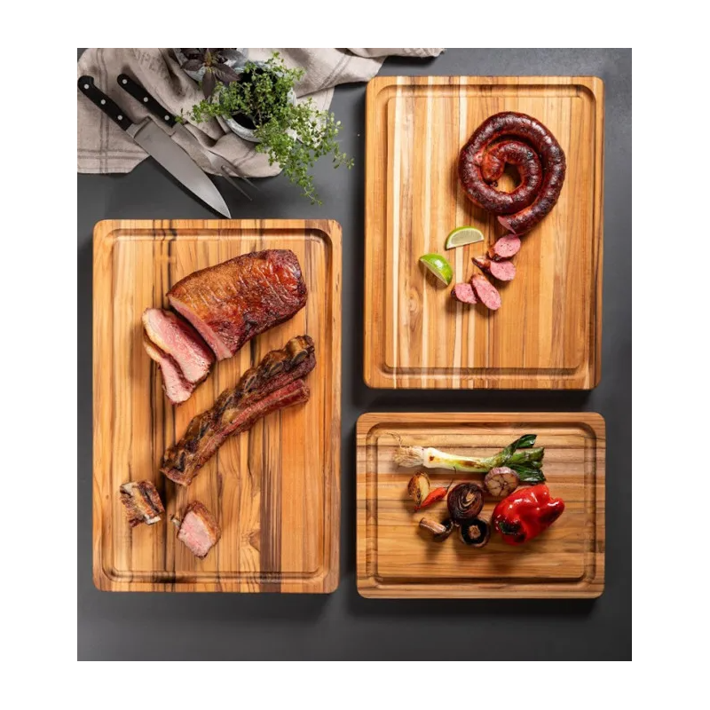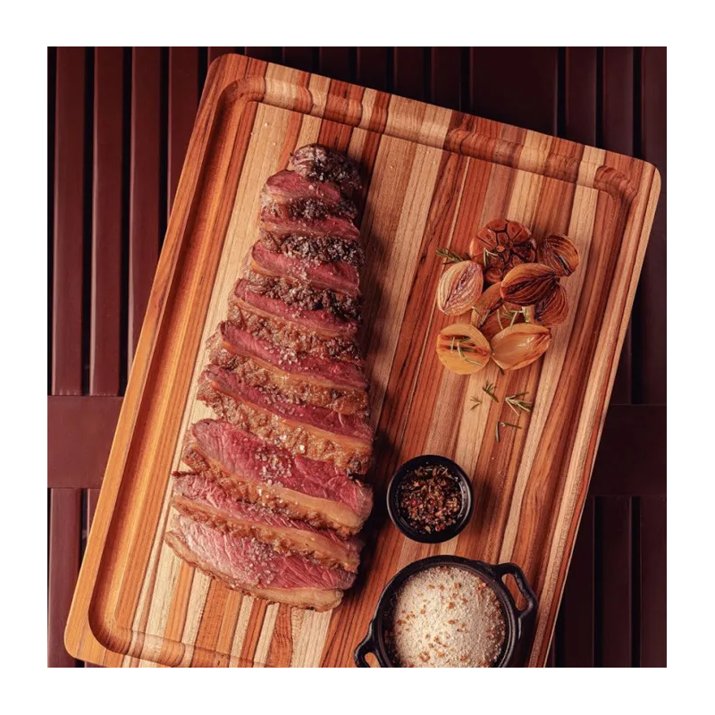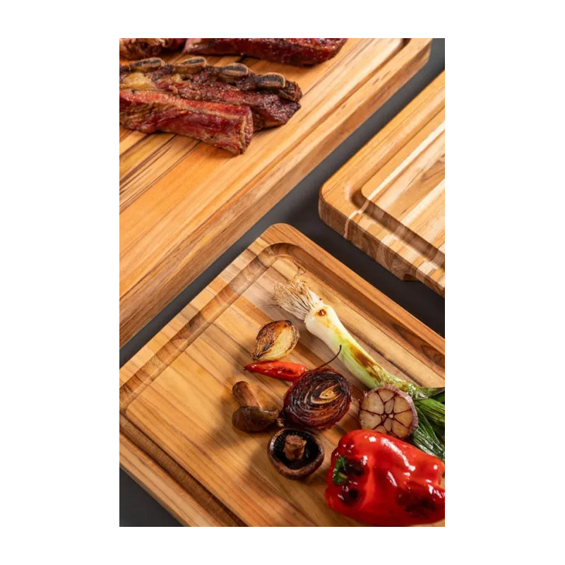 Chaque planche est façonnée avec une attention particulière afin de valoriser les qualités intrinsèques du teck : une surface solide, durable et peu sensible aux entailles ou aux rayures. Pour assurer une hygiène irréprochable, elles sont imprégnées d’huile minérale, un traitement traditionnel qui scelle les pores du bois et empêche le développement des bactéries, garantissant ainsi une utilisation sûre au quotidien.