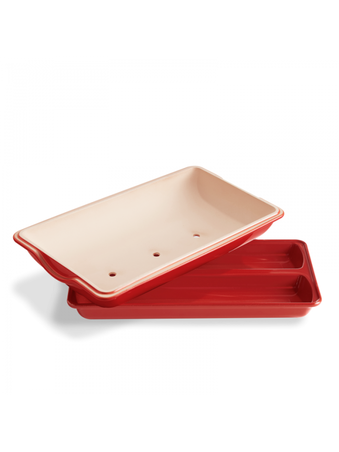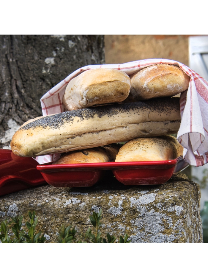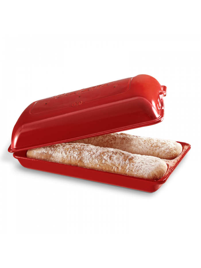 Simple à utiliser, il suffit de placer les pâtons de pâte à pain ciabatta dans les empreintes prévues à cet effet dans le plat, poser le couvercle et mettre le tout au four.