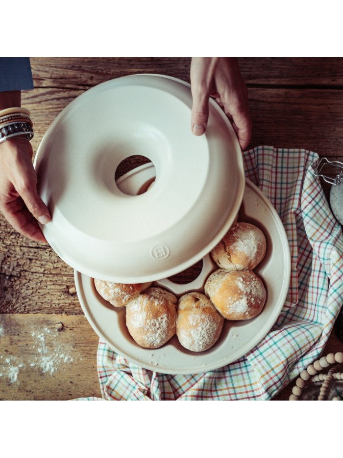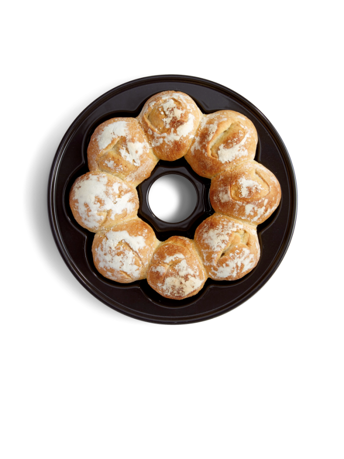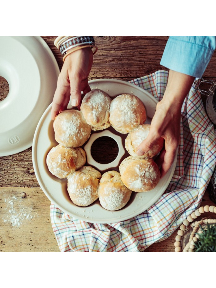 Tour de magie boulangère ? Le moule diffuse une chaleur homogène et assure le taux d’humidité nécessaire à la cuisson du pain, comme dans un four traditionnel. Ses huit alvéoles forment une ronde de petits pains faciles à détacher. Une jolie façon d’organiser des goûters sains et gourmands, d’agrémenter vos repas de fête ou votre quotidien – avec en prime, un délicieux parfum de pain chaud dans la maison...