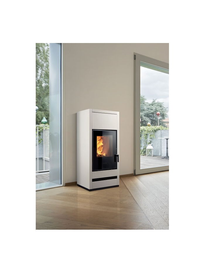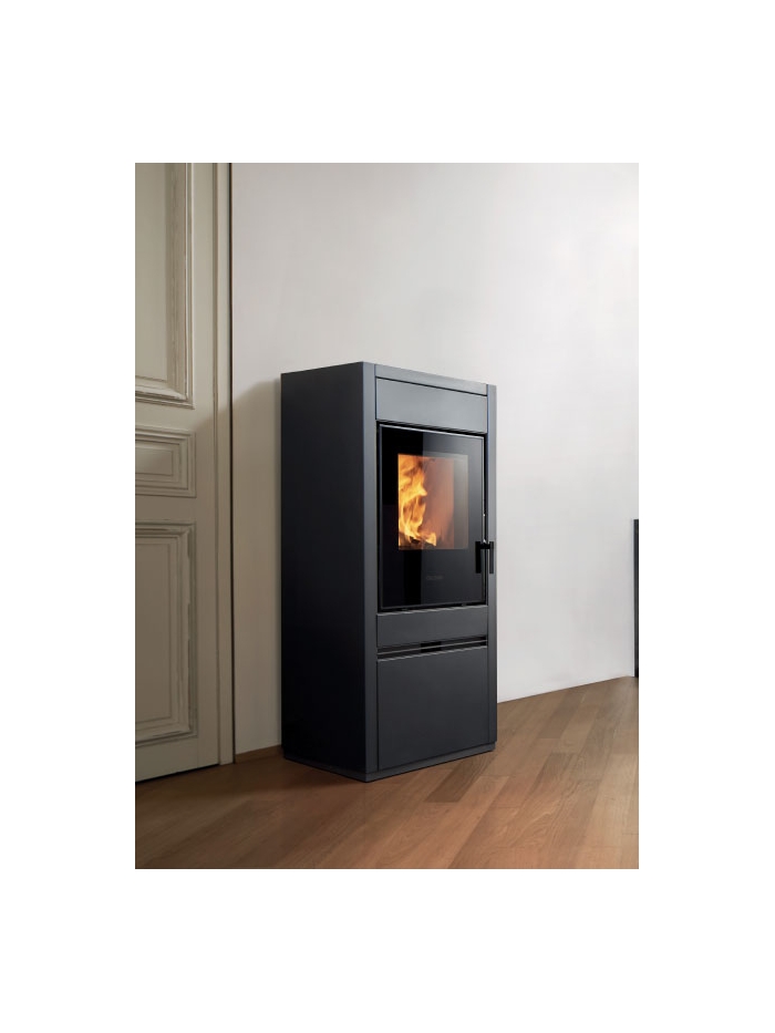 Poêle à bois modèle E128/A avec un revêtement en acier, pouvant être installé près d'un mur ou dans un angle. Ce poêle au design linéaire avec un plateau supérieur en Faïence chauffe la pièce par convection naturelle et rayonnement.
