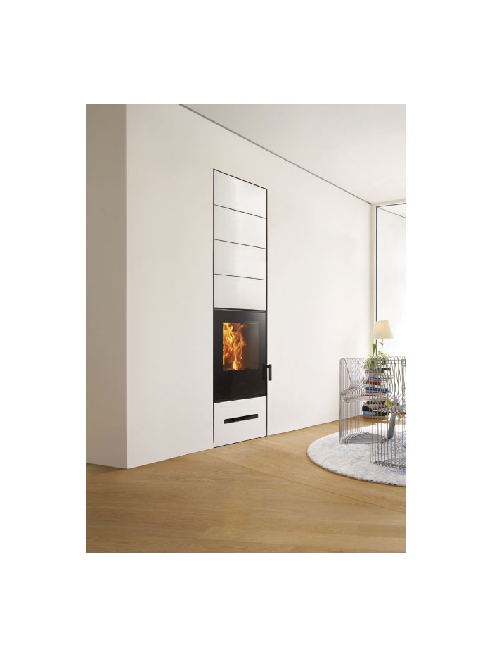 Une manière originale d'habiller son poêle à bois et d'aménager son intérieur. Un revêtement céramique, apportant design et style. Une installation à plat contre le mur pour une esthétique élégante et propre, avec un système de déplacement de l'appareil en translation. Outre son esthétisme, ce concept permet de dissimuler le poêle à bois au sein de son intérieur.