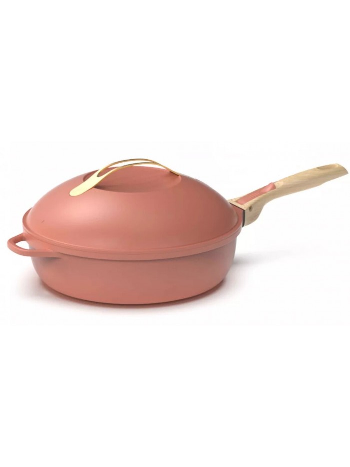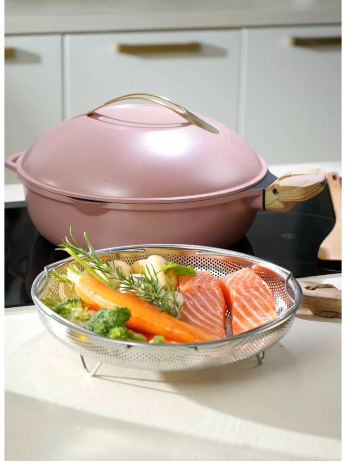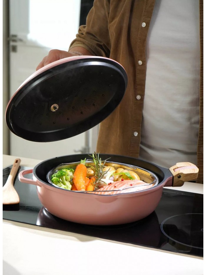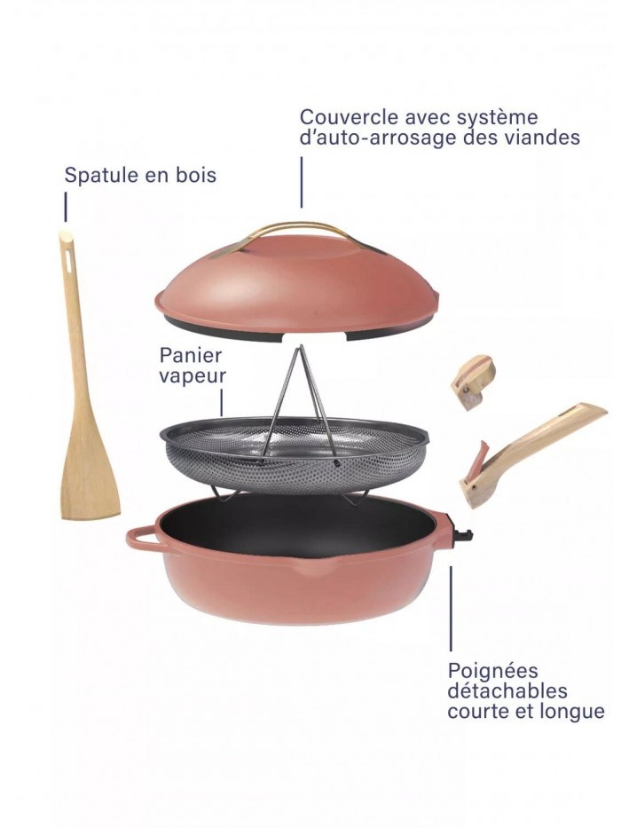 Inclus : 2 poignées détachables (une longue et une courte), un panier vapeur et une spatule en bois.