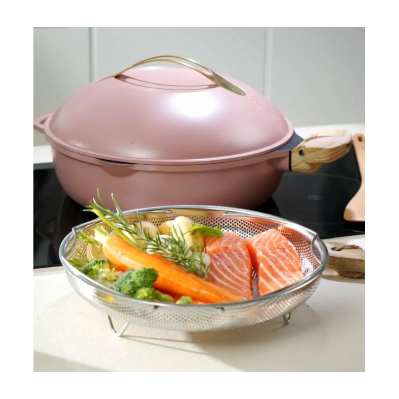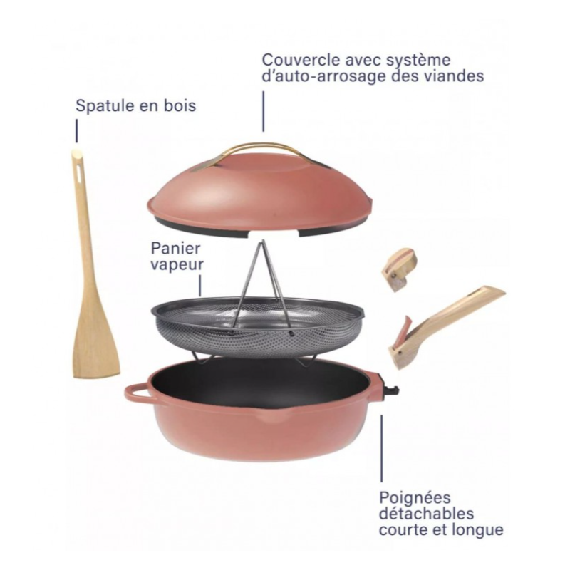 Inclus : 2 poignées détachables (une longue et une courte), un panier vapeur et une spatule en bois.
