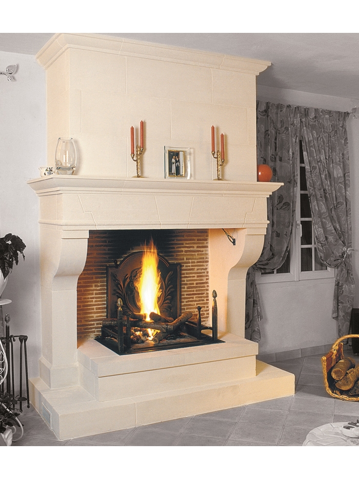 Modèle de cheminée VIEUX-MOULIN présentée avec un foyer STA 405.