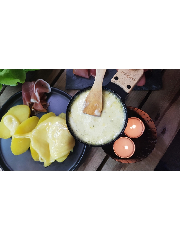 Avec le LUMI, faites fondre votre fromage en 3 minutes juste avec 2 bougies. Cet ustensile très pratique permet à chacun d’avoir son appareil à côté de lui et d’arrêter quand il veut.