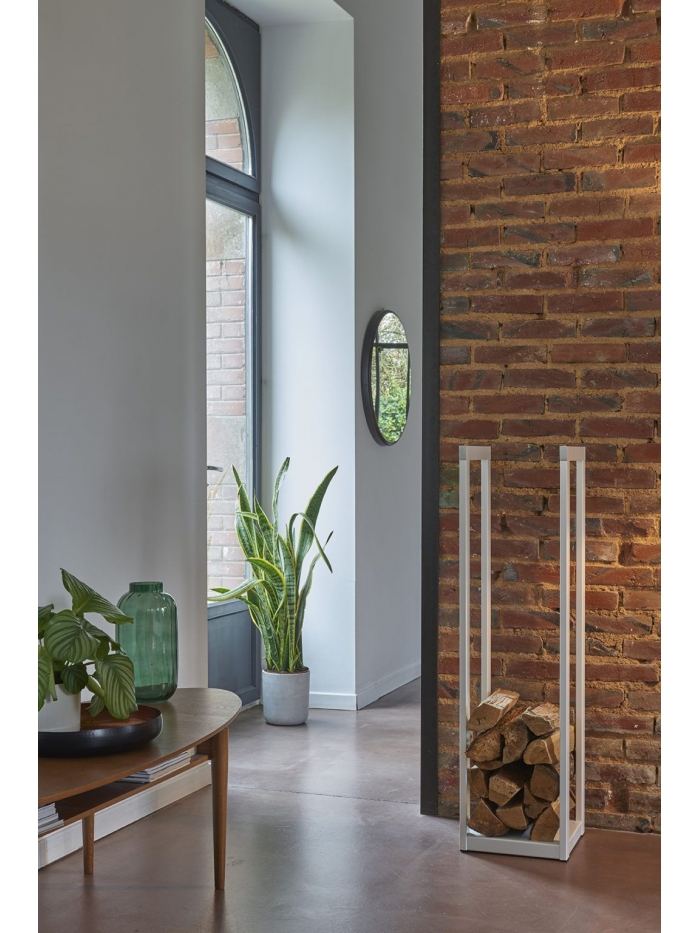 Un design simple et efficace. La structure acier apporte de la verticalité à ce range-bûches, permettant au bois de devenir un véritable élément de déco de votre coin feu.