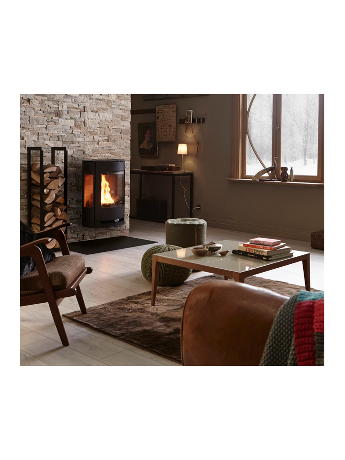 Un design simple et efficace. La structure acier apporte de la verticalité à ce range-bûches, permettant au bois de devenir un véritable élément de déco de votre coin feu.