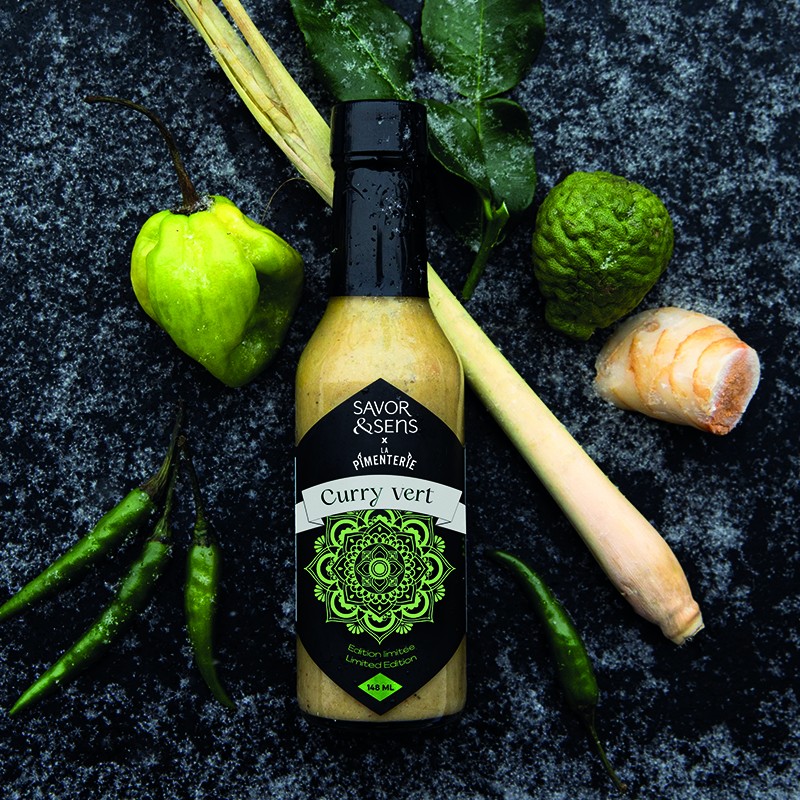 Une sauce piquante au cari vert d’inspiration Thaïlandaise. Une sauce aromatique, parfumée, herbacée, fraiche, épicée et légèrement sucrée.