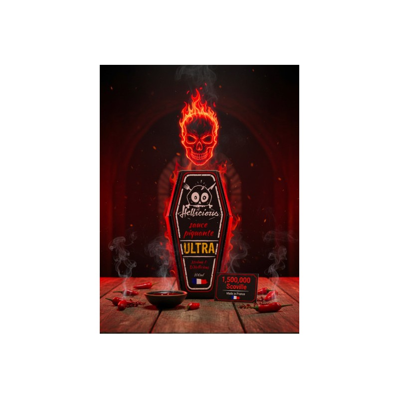 La sauce piquante la plus forte de la gamme Hellicious avec son 1 500 000 sur l'échelle de Scoville !