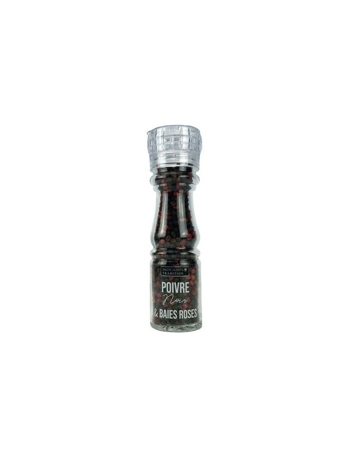 Poivre noir 90% (origine Malaisie), baies roses 10%.