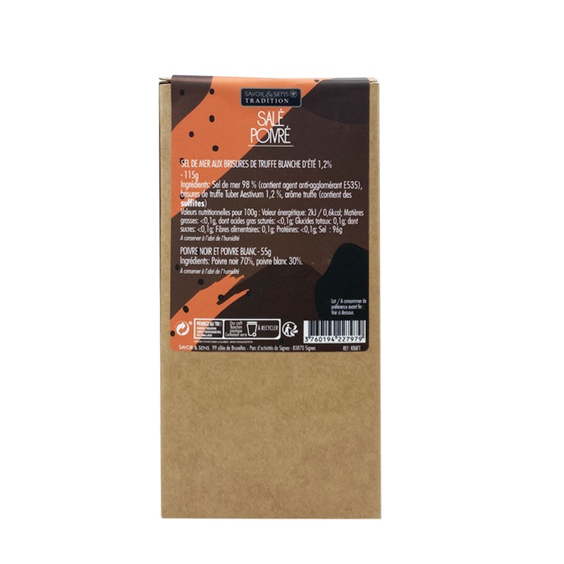 Ce coffret associe un sel de mer sublimé par les brisures de truffe blanche d’été et un mélange exquis de poivre noir et blanc.