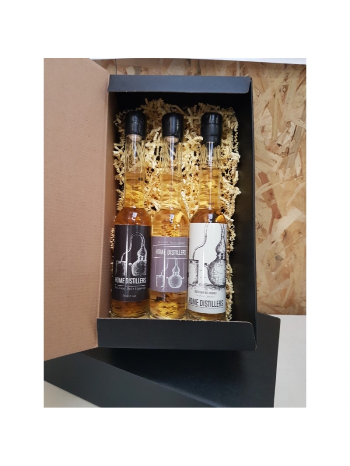 Joli coffret regroupant 3 bouteilles de 20cl de l'ensemble de notre gamme 100% malt d'orge Home Distillers.
