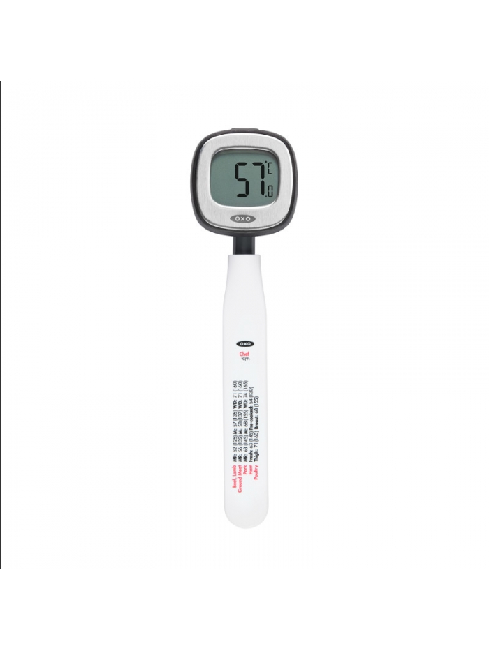 Maîtrisez les cuissons à la perfection grâce à ce thermomètre numérique ! Pour une cuisson à cœur de votre pièce de viande ou pour travailler du chocolat fondu à la bonne température, la précision est de mise. Le grand cadran numérique inscrit nettement la température en cours, en degrés Celsius et en facilite la lecture grâce à sa tête pivotante à 90°. La tige en inox, de 12 cm et très pointue, pénètre au cœur des aliments; sa grande sensibilité permet un affichage immédiat de la température et son excellent calibrage garantit la meilleure précision. Ce thermomètre numérique supporte des températures de -40°C à +150°C. Il est fourni avec un étui de protection et une notice comportant des recommandations de températures de cuisson.
