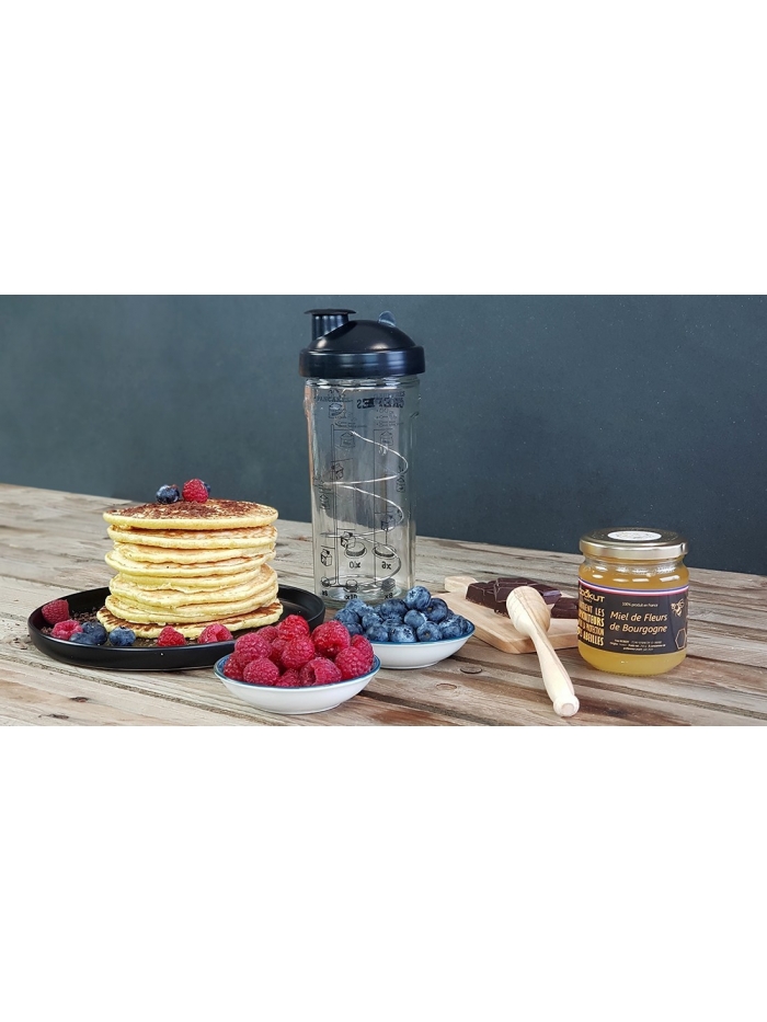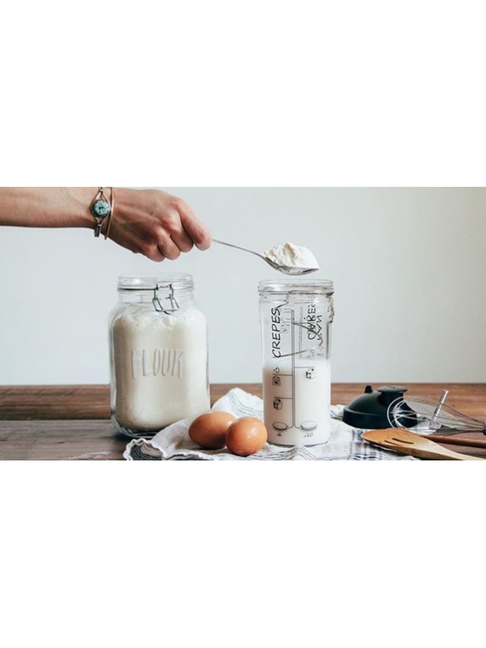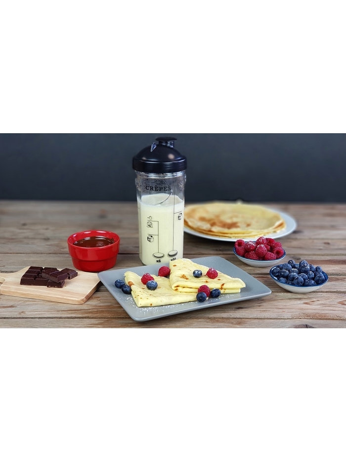 Plus besoin de recette, de robot, de balance, de fouet, de saladier ou de louche ! Il suffit de suivre la recette des crêpes avec les mesures des ingrédients indiquées sur le bocal : le lait, la farine (avec ou sans gluten) et les œufs. Secouez ensuite quelques secondes. C’est prêt ! Versez directement dans la poêle.