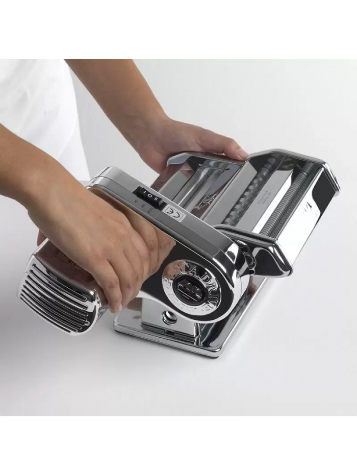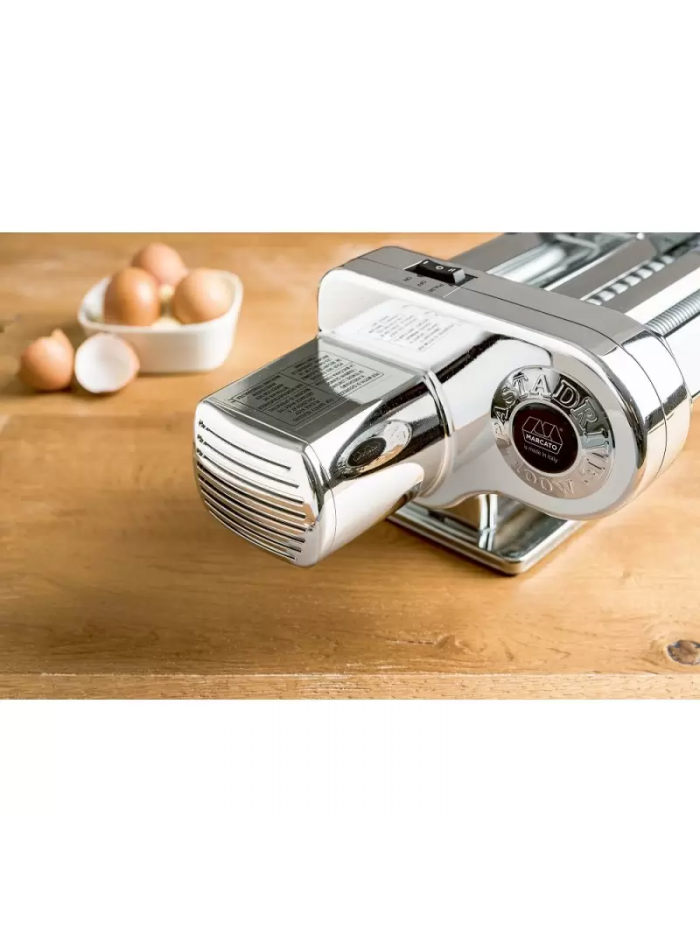 Le moteur pour machines à pâtes fraîches Pastadrive facilite et accélère grandement le travail de préparation de pâtes fraîches maison. Il s’utilise avec tous les laminoirs manuels des lignes Atlas et Ampia de Marcato, ainsi qu'avec certains accessoires Atlas 150.