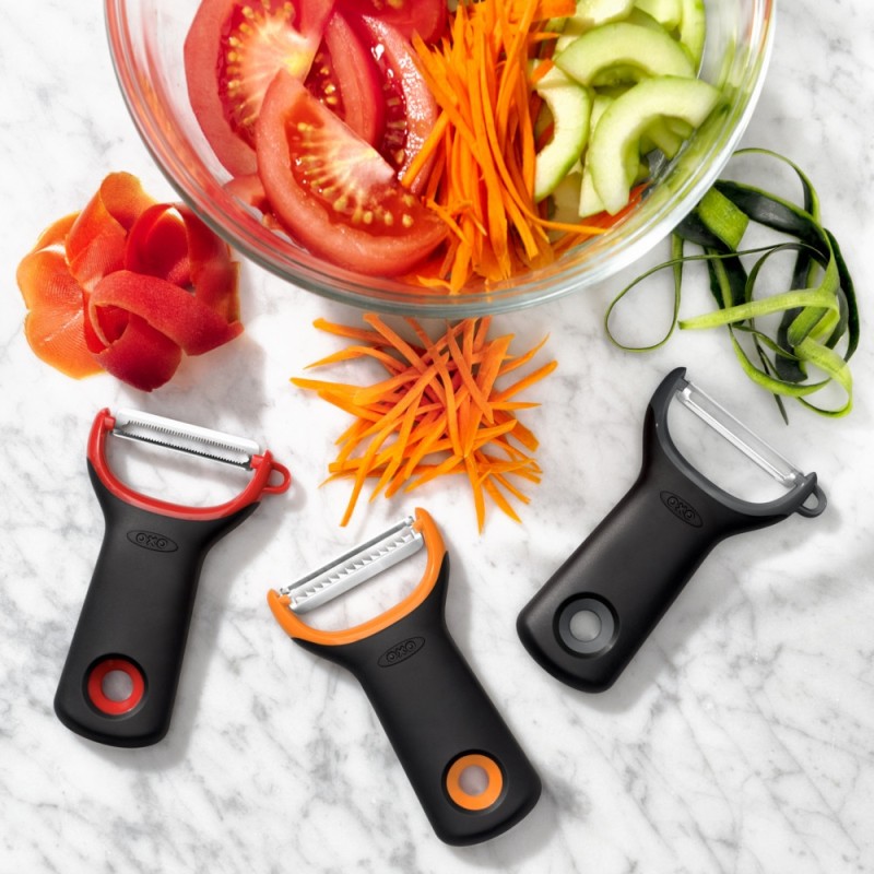 - un éplucheur à tomates et à peaux fines Y avec une lame dentelée et pivotante pour peler les fruits et légumes délicats et mûrs à peau fine, tels que les tomates, les pêches, les kiwis…