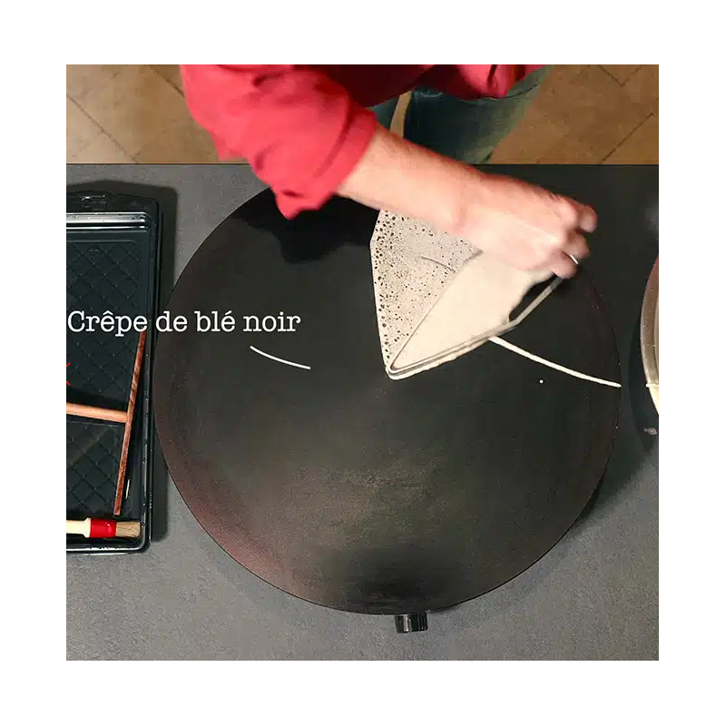 Verser d’un seul coup le contenu d’une louche de pâte dans l’étaleur « EasyCrep’ », sans chercher à la répartir, et tournez instantanément dans le sens des aiguilles d’une montre. Le premier tour doit être effectué en 2/3 secondes. Continuez doucement la rotation jusqu’à étaler le surplus de pâte restant dans l’étaleur « Easy Crep’ », puis reposez-le dans le bac à eau. Vous pouvez également étaler ce surplus à l’aide du râteau en bois.